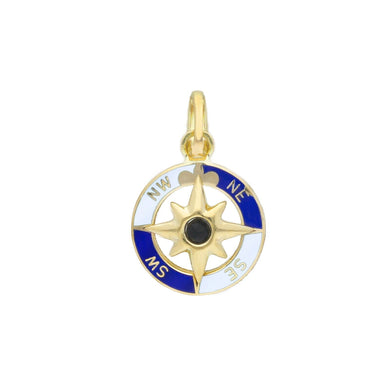 18k yellow gold, white blue enamel round pendant, diameter 15mm compass medal