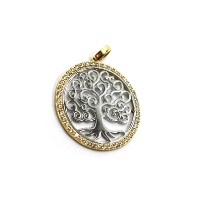• 18k yellow white gold tree of life round pendant diameter 25mm, zirconia frame