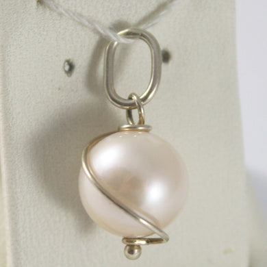 • SOLID 18K WHITE ROUGH GOLD SPIRAL PENDANT WITH ROUND PINK PEARL, MADE IN ITALY