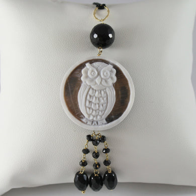 SOLID 18K YELLOW GOLD OWL PENDANT, ONYX AND MOTHER OF PEARL, MADE IN ITALY