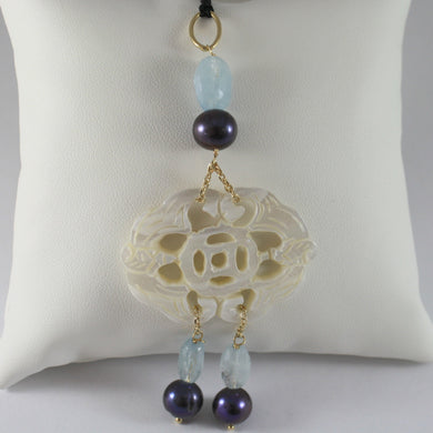 SOLID 18K YELLOW GOLD PENDANT, AZTEC STYLE, BLUE TOPAZ AND PEARLS, MADE IN ITALY