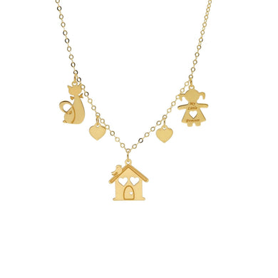 18k yellow gold rolo necklace family with 10mm girl, cat, house, hearts