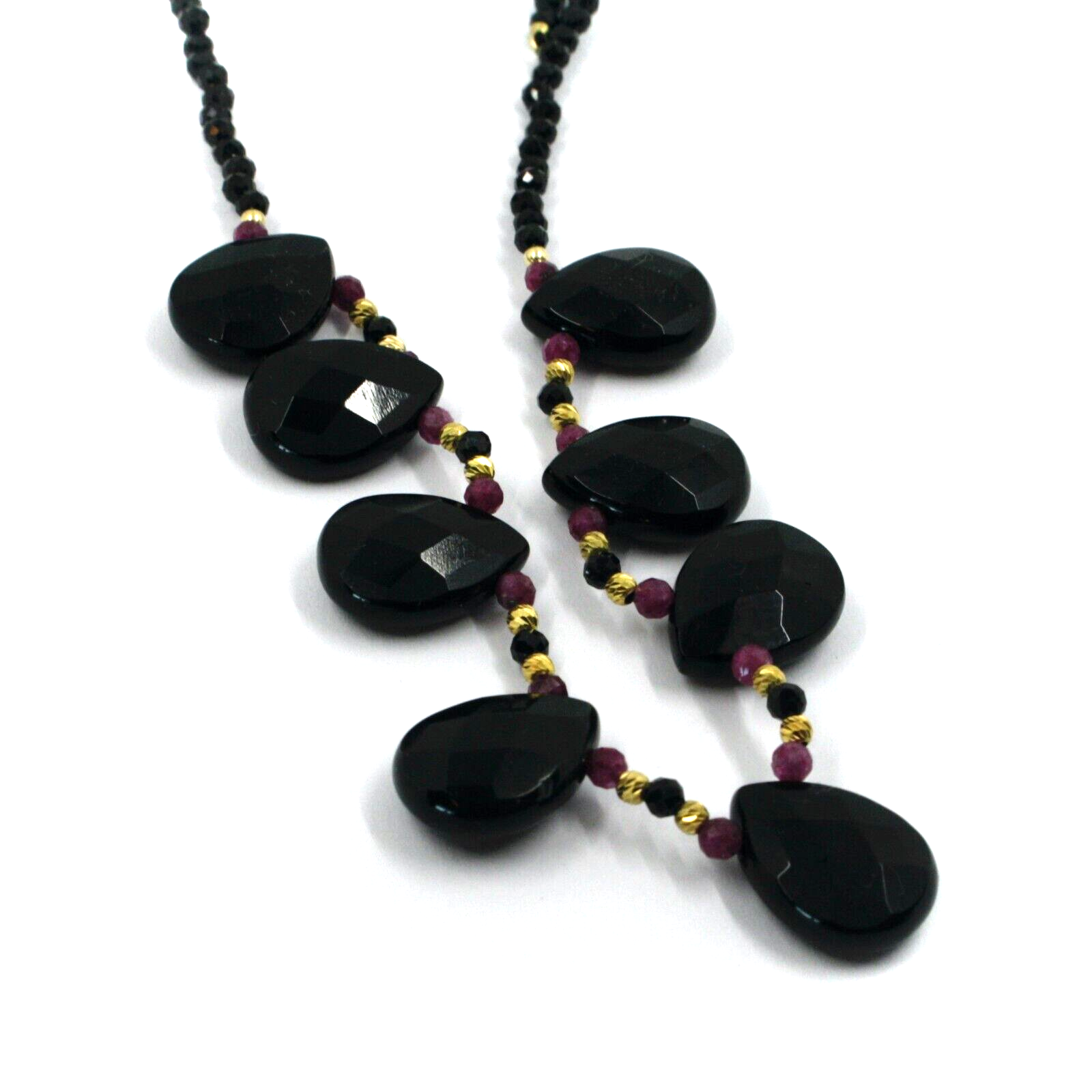 Con espinela negra facetada de 3 mm, rubí rojo y gotas de ónix de 15 mm.