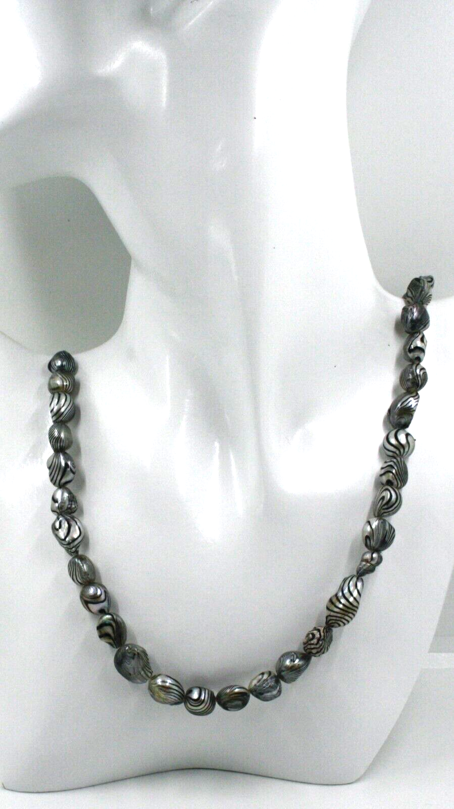 Para mantener el hermoso trabajo de rayas negras en las perlas, recomendamos quitarse el collar antes de ducharse o bañarse y evitar el contacto con productos que contengan sustancias agresivas como perfumes (la recomendación es rociar el perfume y usar el collar solo después de que se haya secado).