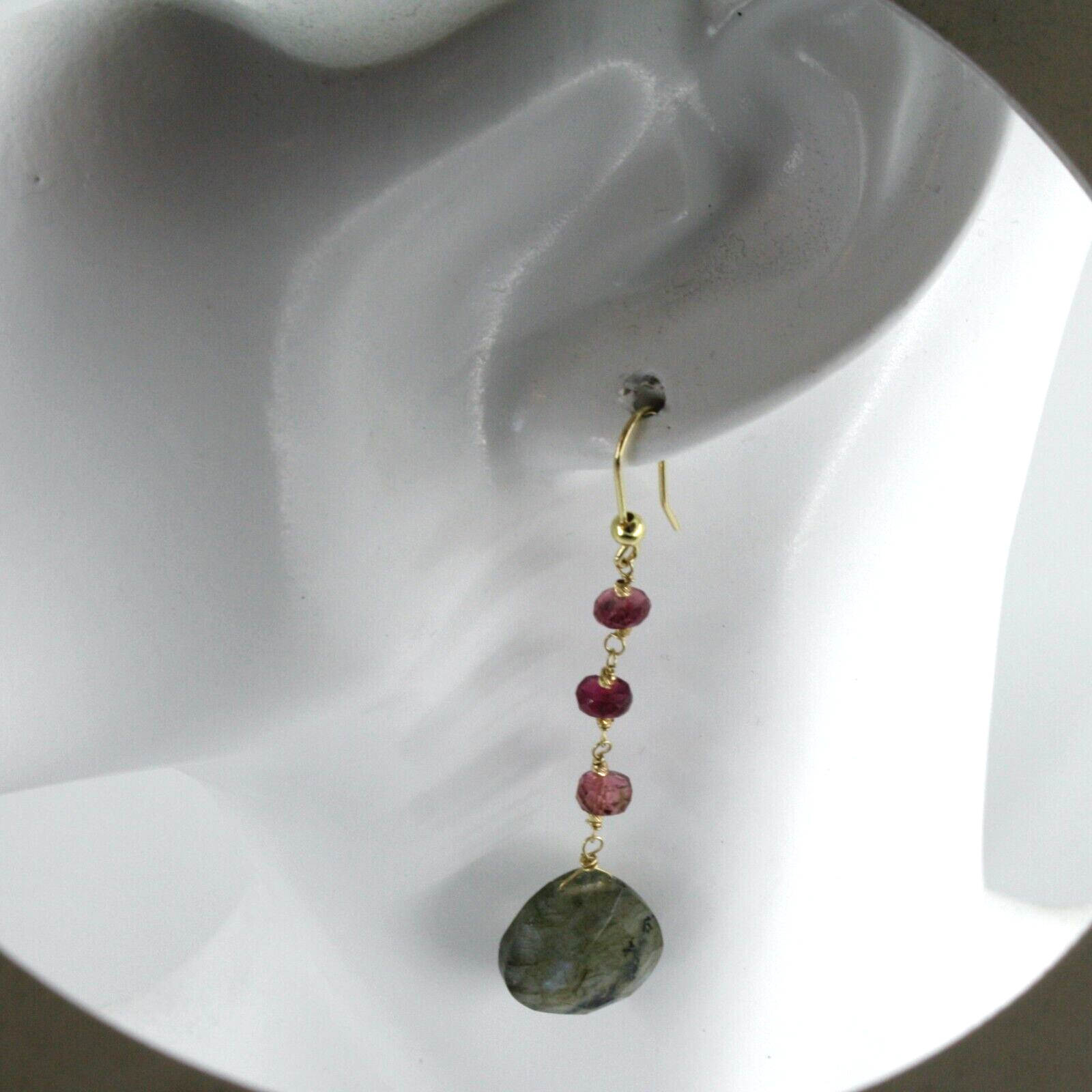 Piedras: rubíes de 5 mm de diámetro y gotas de labradorita de 15 mm de largo.