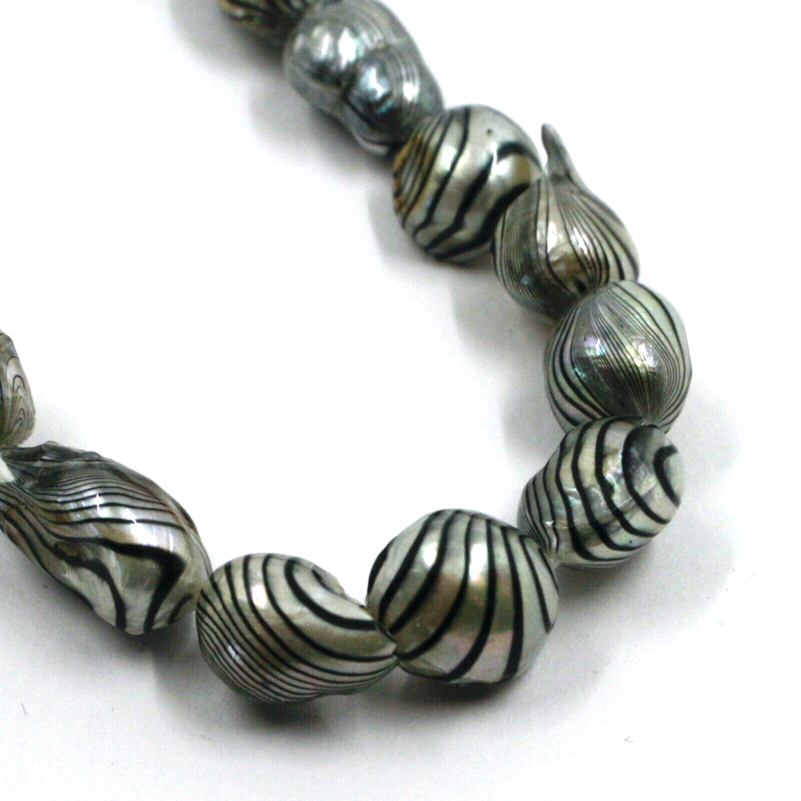 con perlas de agua dulce barrocas ovaladas de color gris de 9/14 mm pintadas con rayas.