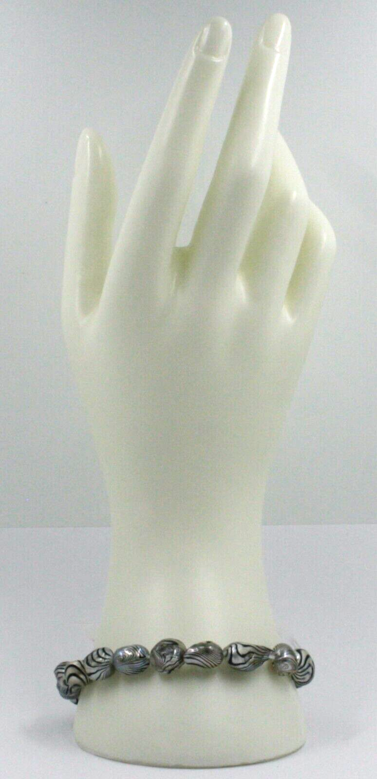 Para mantener el hermoso trabajo de rayas negras en las perlas, recomendamos quitarse la pulsera antes de ducharse o bañarse y evitar el contacto con productos que contengan sustancias agresivas como perfumes (la recomendación es rociar el perfume y usar la pulsera solo después de que se haya secado).
