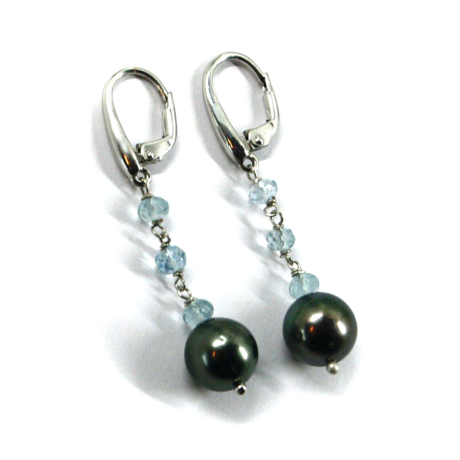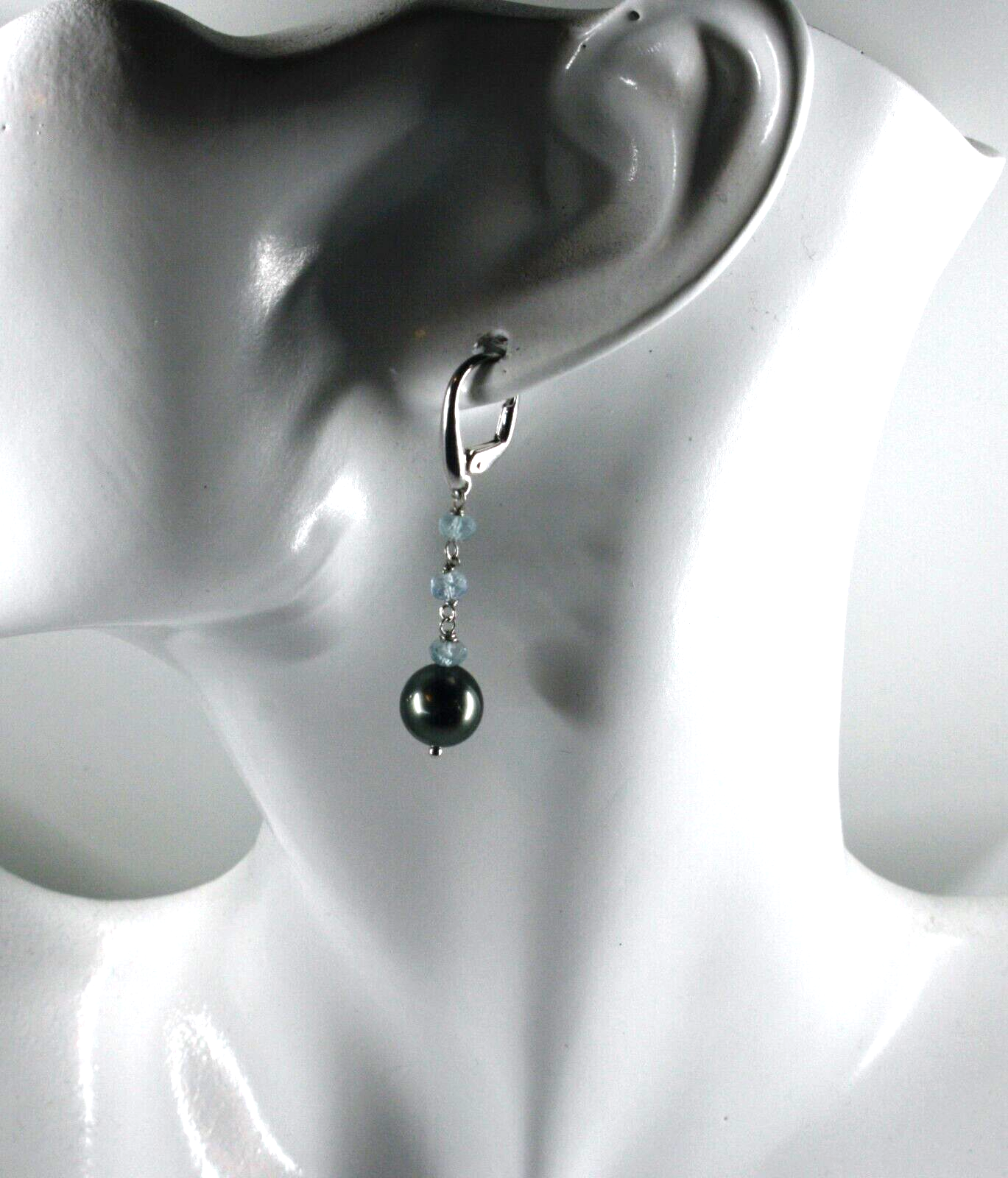 BOUCLES D'OREILLES EN OR BLANC 18 CARATS AVEC PERLES NOIRES DE TAHITI ET AIGUE-MARINE