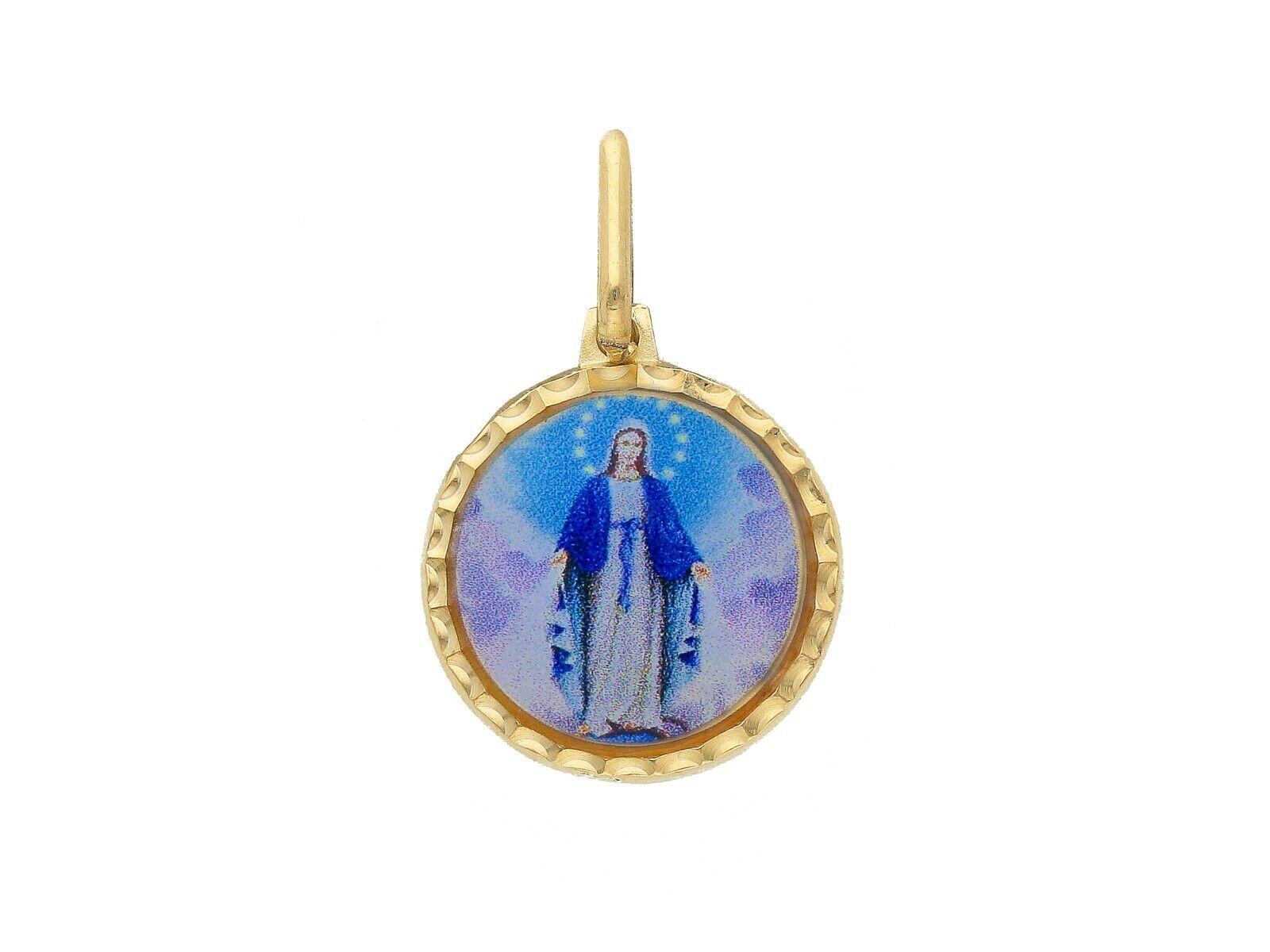 Pendentif rond en or jaune 18 carats émaillé, 15 mm, médaille de la Vierge Miraculeuse
