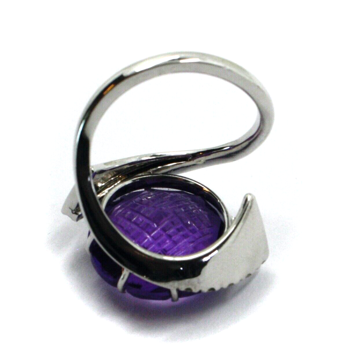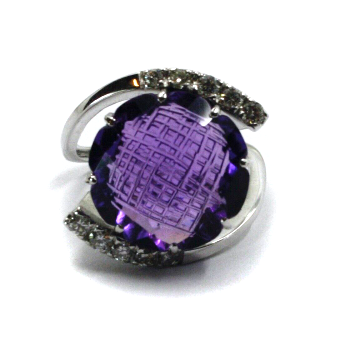 . Stone: Amethyst with very particular cushion cut, 12 carats, diameter 16mm and 10 Diamonds, total carats 0.38, color G, clarity vvs
