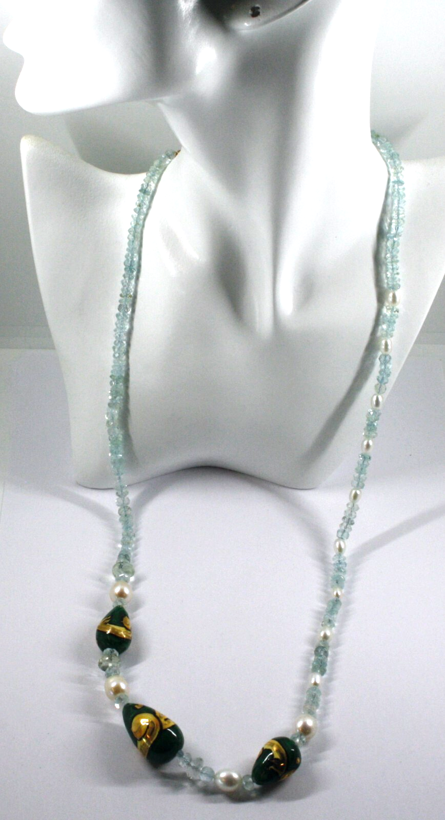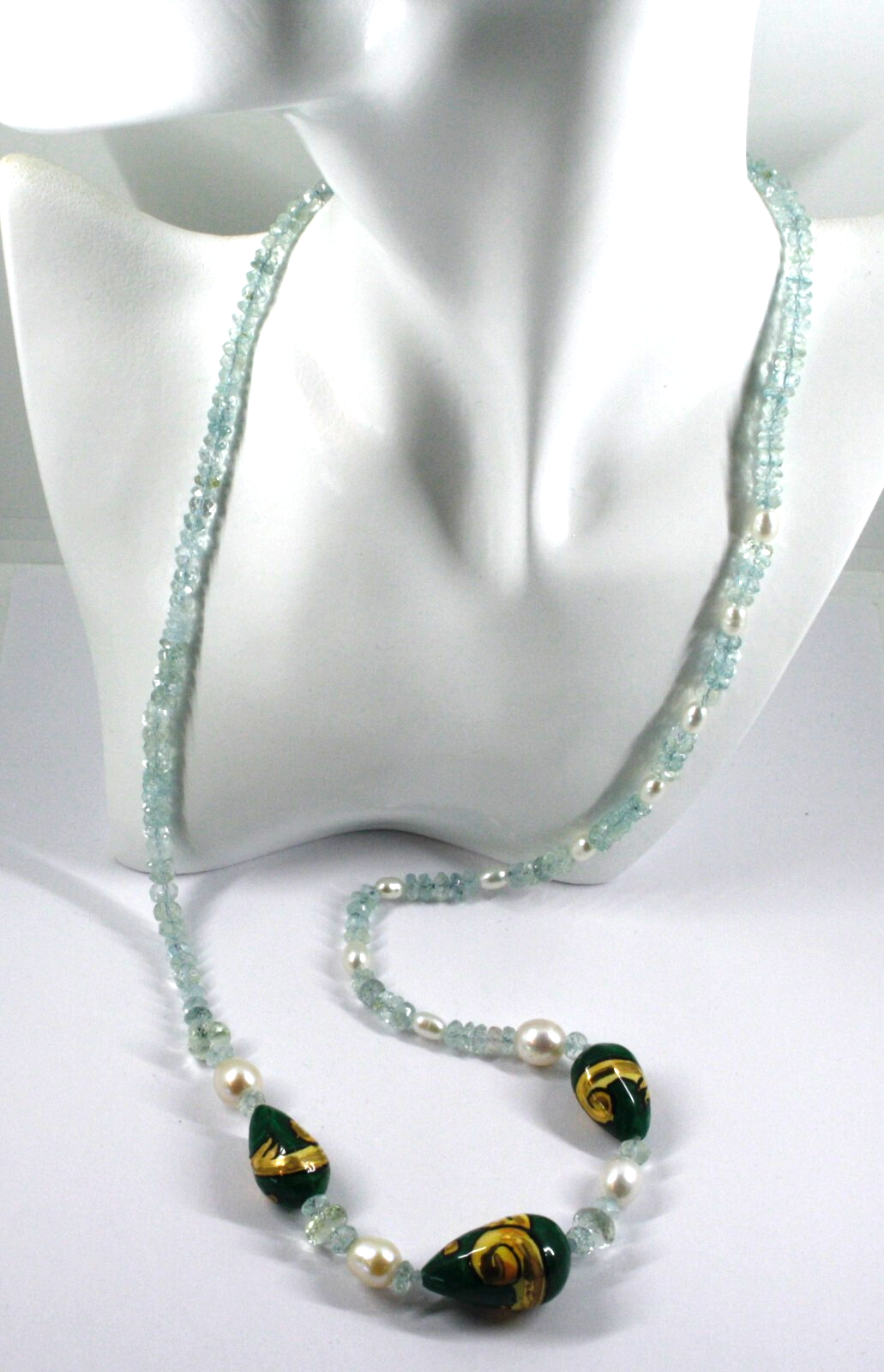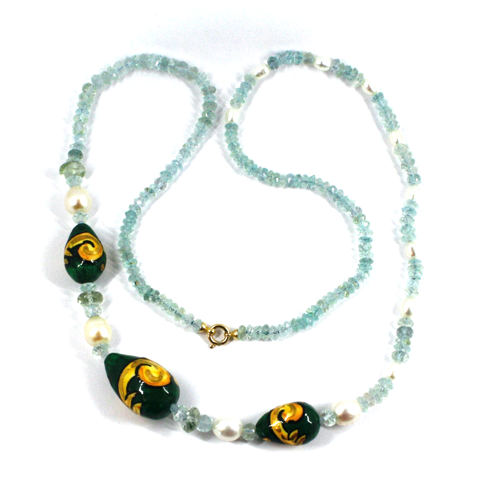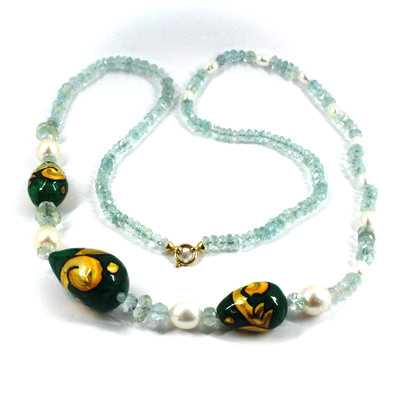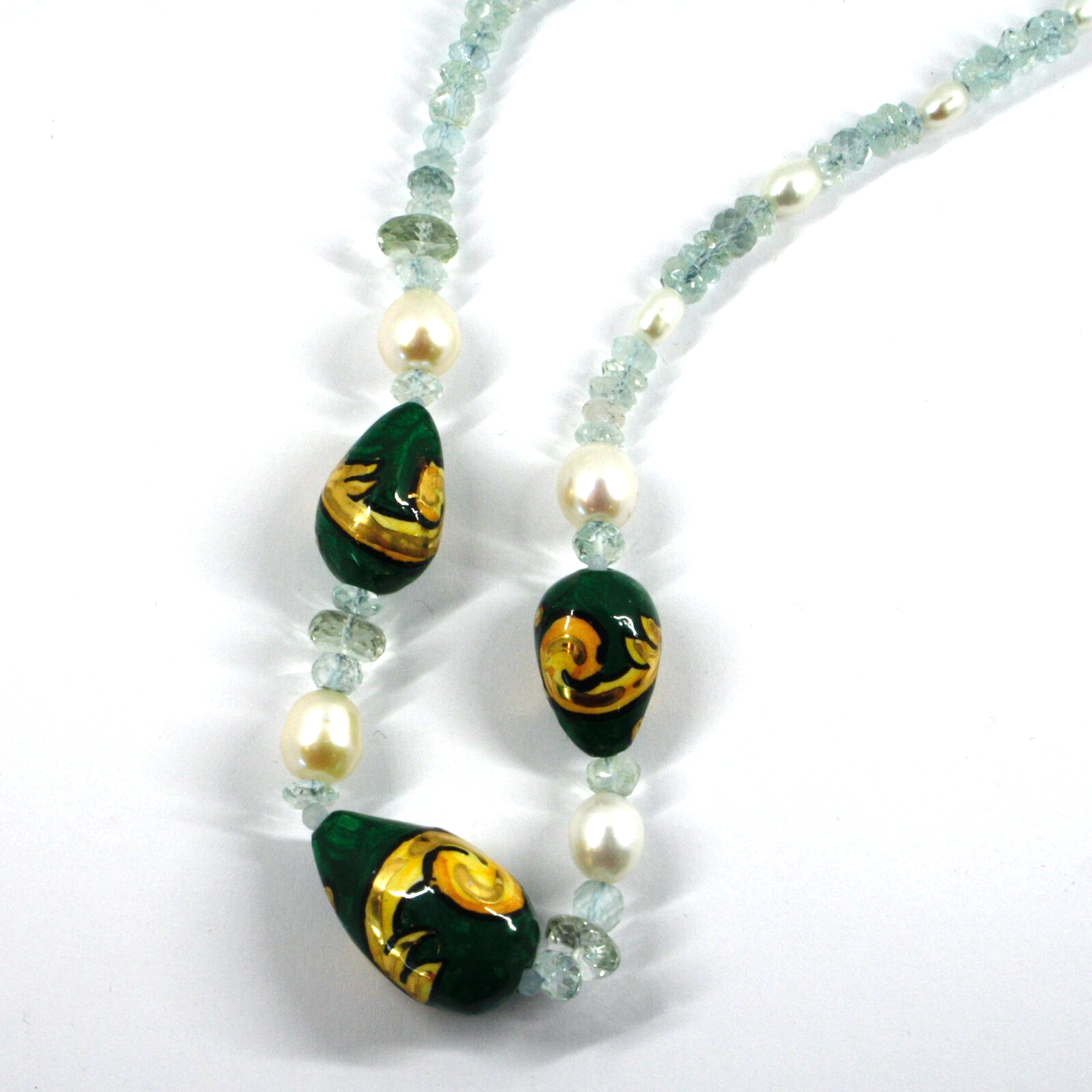 Aquamarine, pearls, peridot ceramic hand painted drops necklace 18k gold closure
