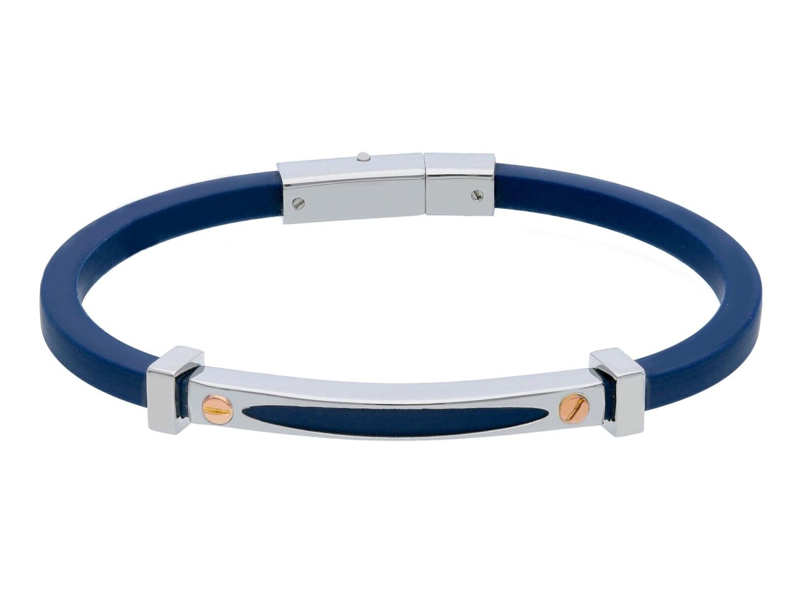 BRACELET 5mm BLUE RUBBER SQUARE TUBE, STAINLESS STEEL PLATE, 18K GOLD INSERTS