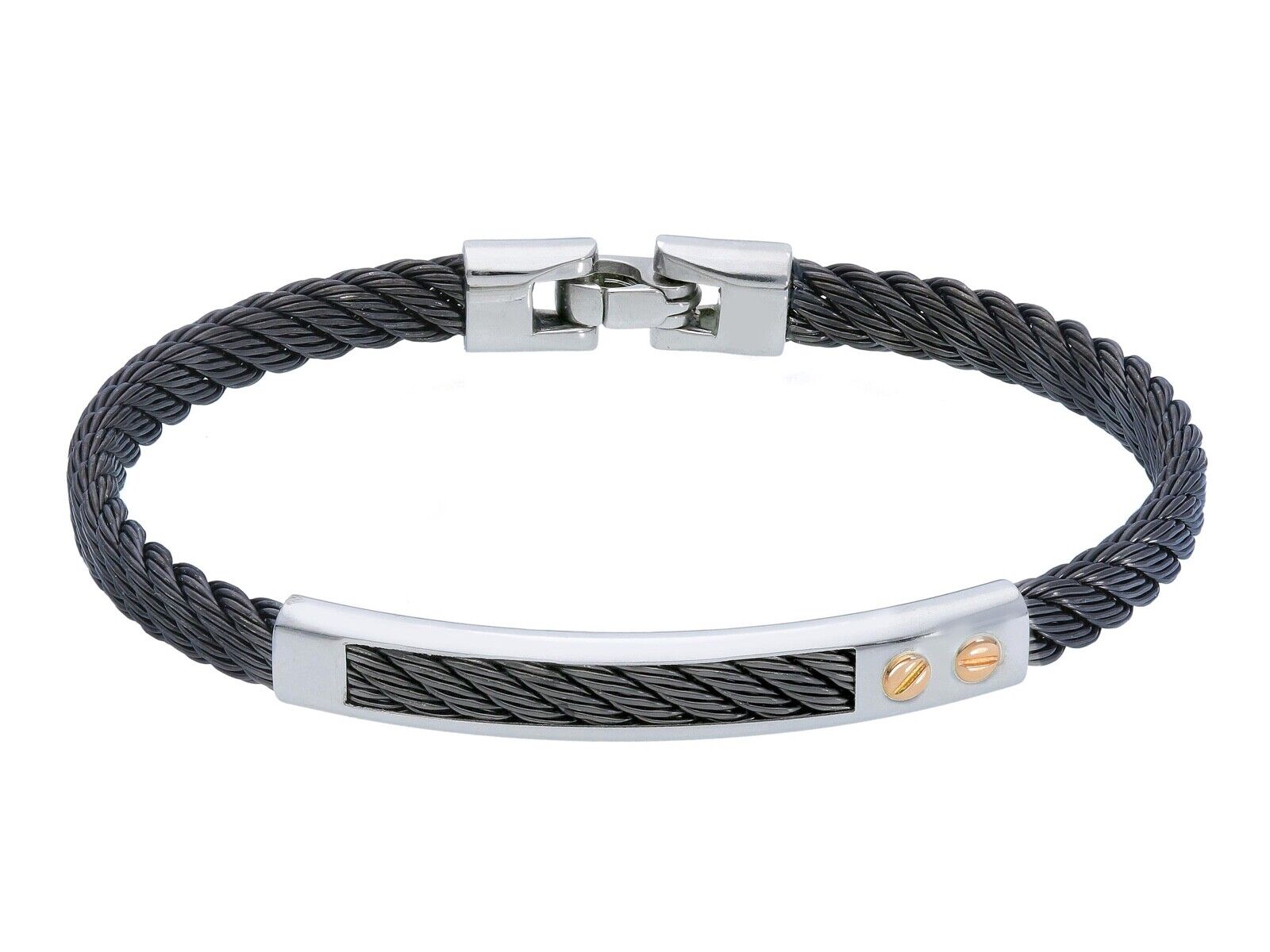 BRACELET 6mm BLACK ROPE BRAIDED CABLE, STAINLESS STEEL PLATE, 18K GOLD INSERTS